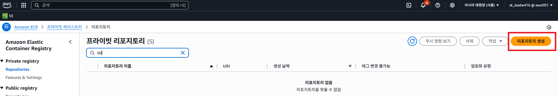 이제 Docker Image 를 ECR에 Push하기 전에, 먼저 Push할 ECR 리포지토리를 생성해 보겠습니다.