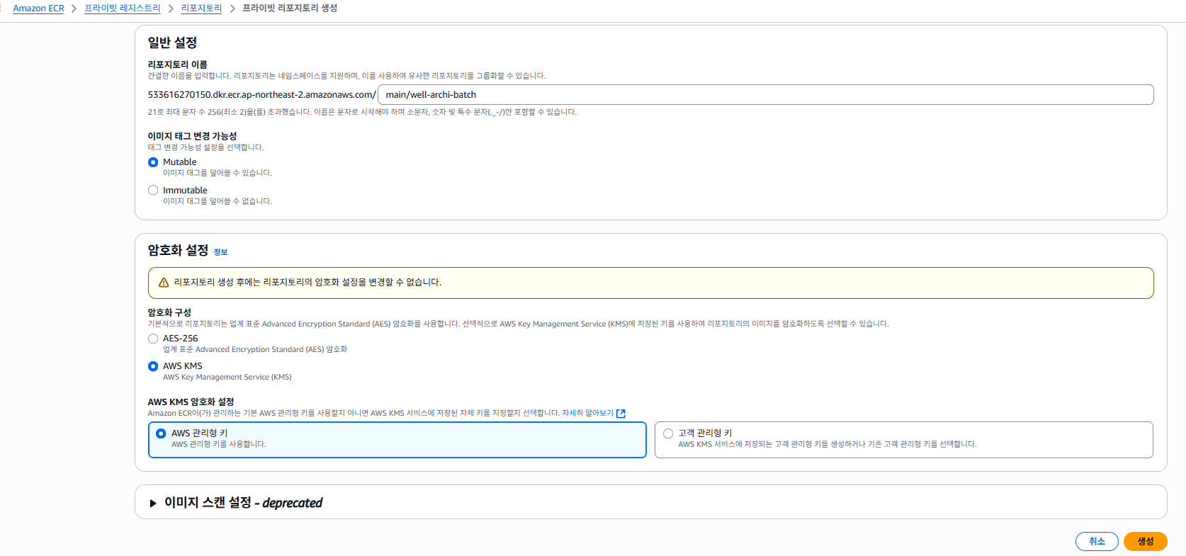 리포지토리 이름을 ‘main/well-archi-batch’로 지정하고 KMS 암호화를 선택했습니다.