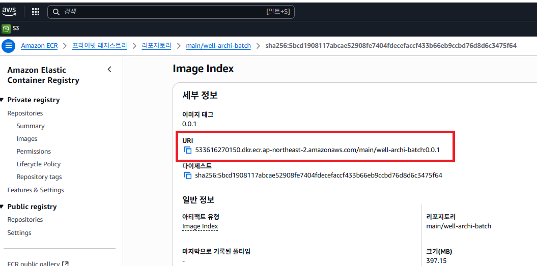 첫 번째 화면에서 0.0.1 태그를 클릭하면 이미지 URI가 생성되며, 이 URI를 통해 AWS Batch에서 해당 이미지를 불러올 수 있습니다.