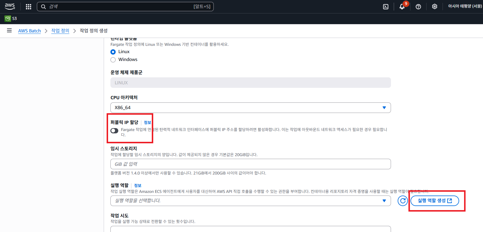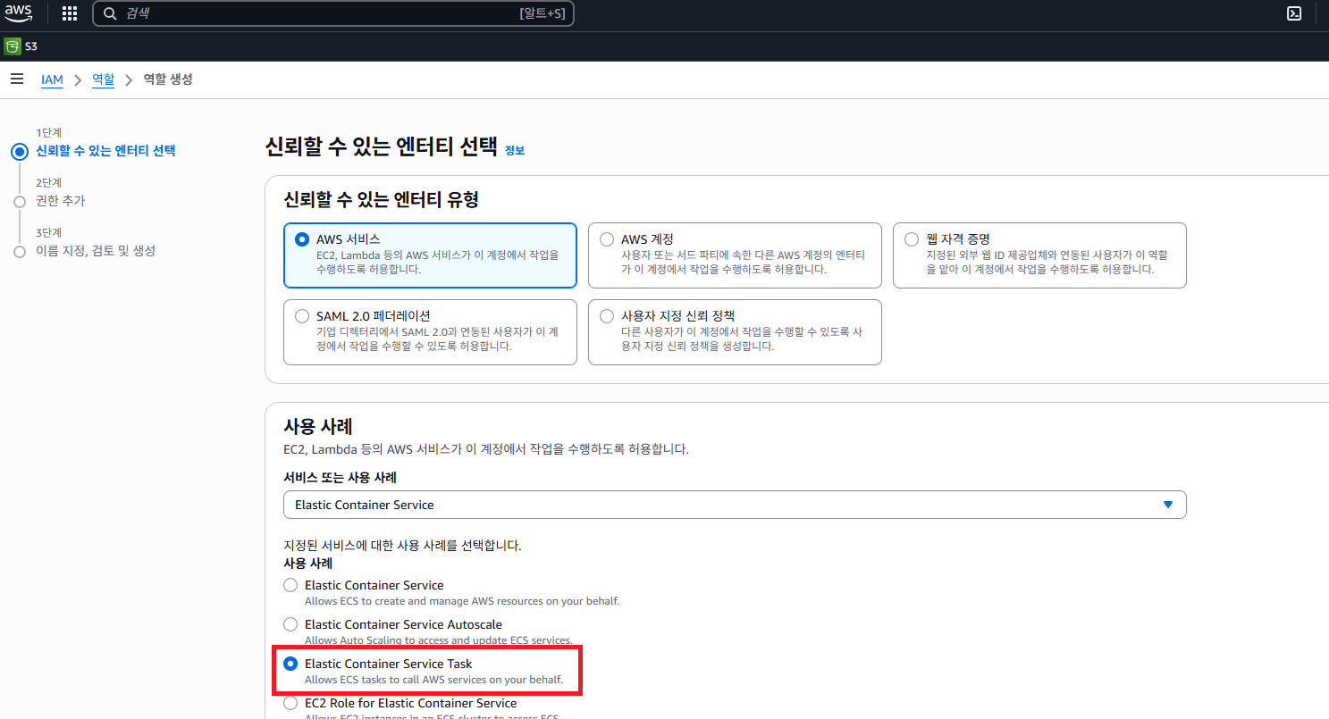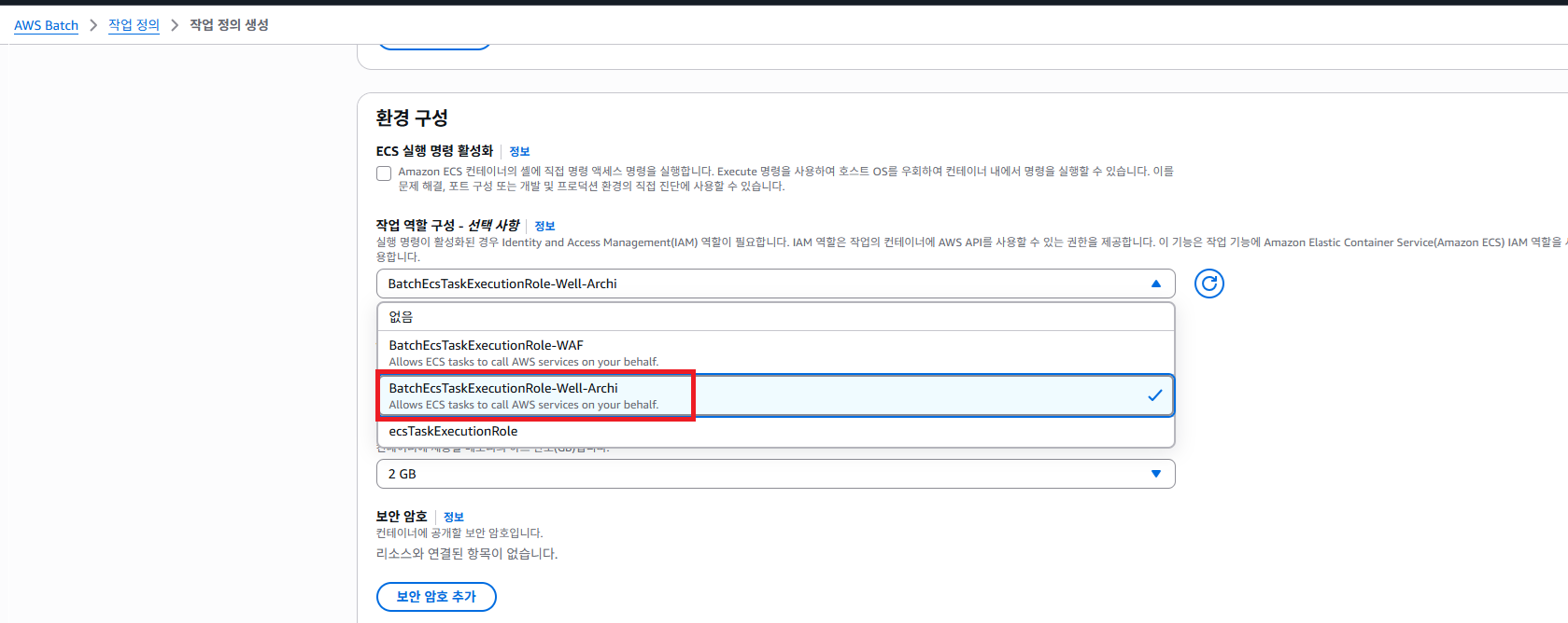 다시 작업 정의 생성 화면으로 돌아와서 위에서 생성한 Role을 맵핑합니다.