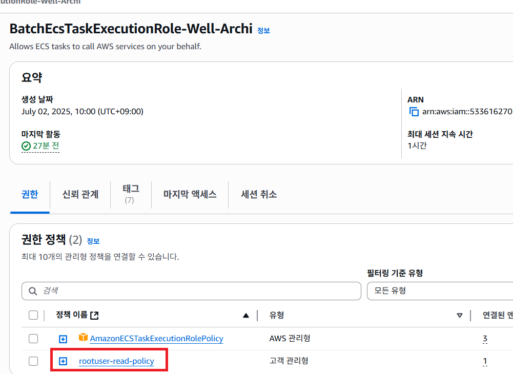 위에서 추가한 rootuser-read-policy 를 작업 역할 구성에 넣어야 배치 실행 시 Root User 조회가 가능하기 때문에 위에서 생성한 Role을 맵핑해 줍니다.