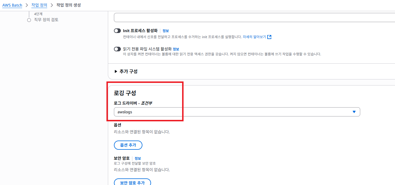 로그 드라이버는 awslogs를 선택하여 CloudWatch를 통하여 로그를 볼 수 있도록 설정합니다.