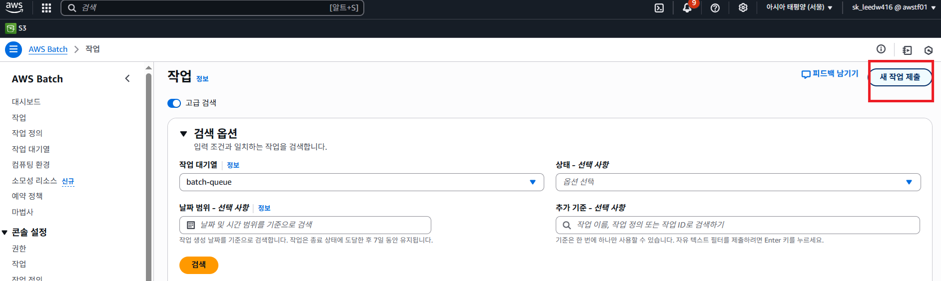 작업 콘솔에 들어가서 새작업 제출 버튼을 클릭합니다.