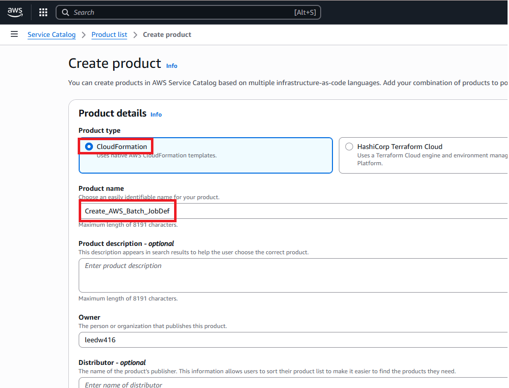 ‘AWS Batch’라는 이름의 Portfolio 를 만들었습니다. 해당 Portfolio 내에 첫 번째 제품(Product)으로 Job Definition 생성을 위한 Prouduct 를 생성해 보겠습니다.
