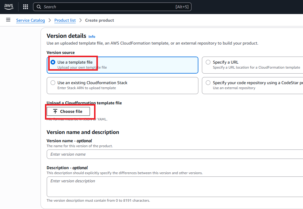 위에서 작성한 템플릿을 .yaml 확장자로 저장한 뒤, 아래 화면의 Choose file을 클릭해 해당 파일을 선택하고 Product 생성(Create product) 을 진행합니다 .