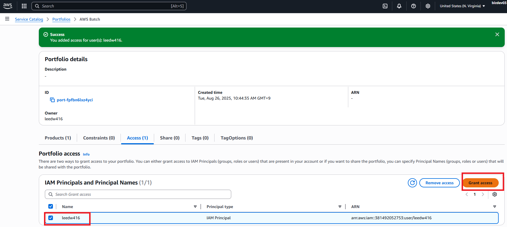생성한 Product가 Service Catalog 콘솔의 Provisioning → Products 목록에 표시되려면, AWS Service Catalog의 ‘AWS Batch’ 포트폴리오에서 Access 탭을 열어 현재 콘솔 사용자(또는 해당 IAM 사용자/그룹/역할)를 Principal로 추가해야 합니다. 포트폴리오 단위로 권한을 부여하면 해당 포트폴리오에 속한 Product에 액세스 권한을 제어할 수 있습니다.