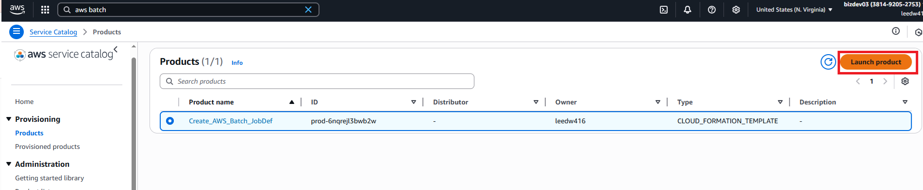 설정을 완료하면 아래 그림처럼 ‘Create_AWS_Batch_JobDef’가 Provisioning → Products 목록에 표시됩니다. 해당 Product를 실행하려면 Launch product 버튼을 클릭하세요.