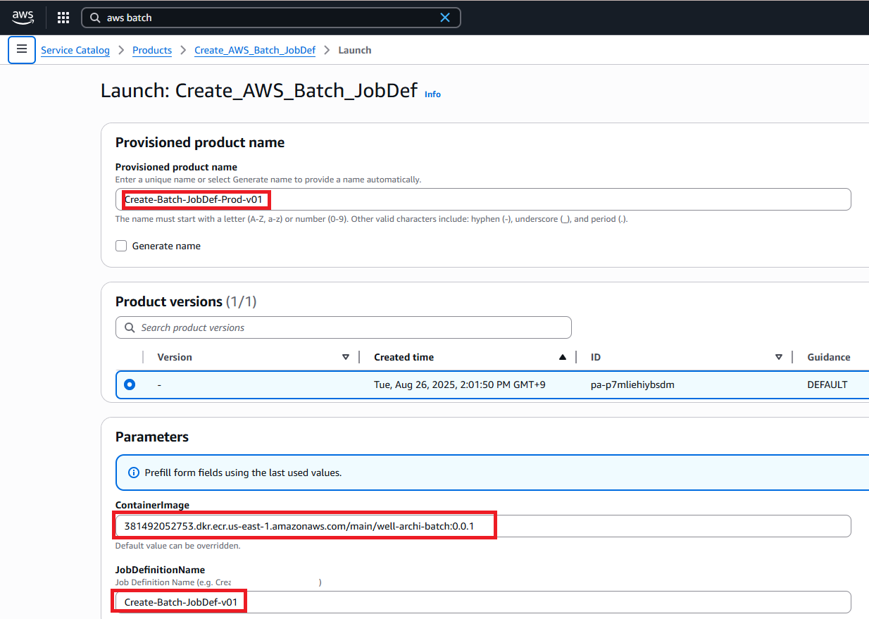 Launch 화면에서 CloudFormation 템플릿에 정의한 두 파라미터(ContainerImage, JobDefinitionName)를 입력합니다. 배치 구성 변경으로 컨테이너 이미지가 바뀌면 이에 맞춰 Job Definition 이름, ContainerImage URI 도 달라질 수 있으므로, 두 값을 파라미터로 노출해 유연하게 수정할 수 있게 했습니다. 아래 그림의 빨간 박스 영역을 채운 뒤 Launch product를 클릭하여 Job Definition을 생성하세요