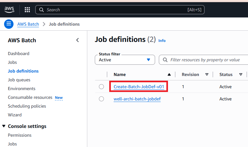 Launch가 완료되면 아래와 같이 Job Definitions가 생성됩니다.생성된 Job Definition의 상세 정보를 확인하면, 앞서 정의한 CloudFormation 템플릿 설정이 실제로 적용되었음을 확인할 수 있습니다. 이처럼 AWS Service Catalog를 사용하면 콘솔에서 수동으로 생성할 때 소요되는 시간을 줄이고, 누구나 동일한 표준 설정으로 일관되게 배포할 수 있습니다.